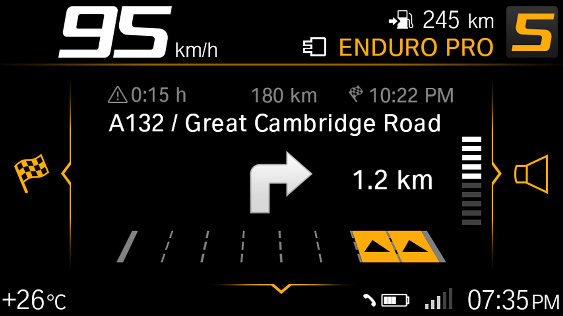 Como no podía ser de otra manera, la navegación también incluye todo lo necesario para llevar a los moteros a su destino: indicaciones precisas para girar mediante flechas o comandos de voz, guía exacta y datos de tráfico en tiempo real; así como indicaciones de límite de velocidad y búsqueda de un punto de interés. En la aplicación también podrás consultar la información meteorológica actual.