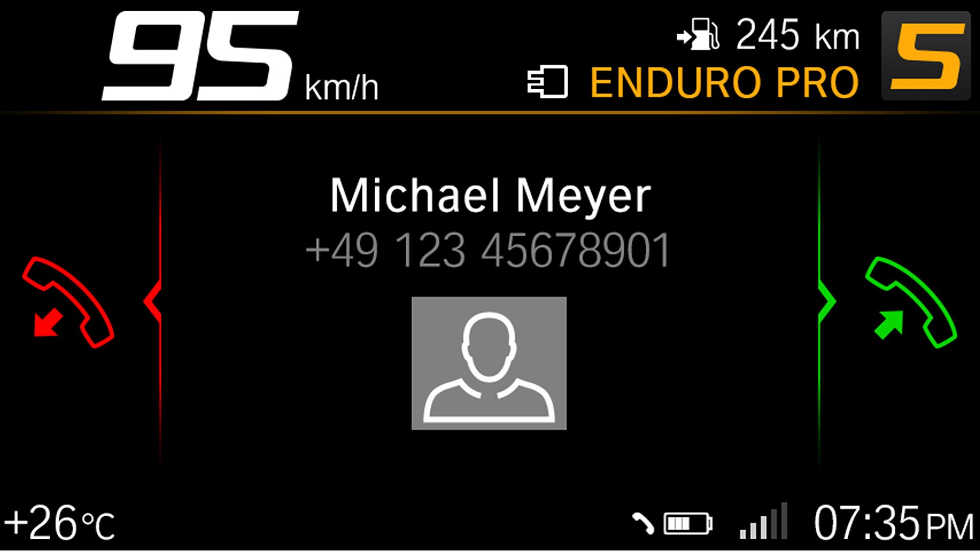 La combinación de un casco con sistema de comunicación BMW Motorrad y el accesorio opcional Connectivity te permite realizar llamadas durante tu viaje. El conductor tiene acceso completo a la lista de contactos de su smartphone a través de la pantalla TFT y puede elegir llamar a un contacto a través del multicontrolador. Las llamadas entrantes también se muestran en la pantalla y pueden aceptarse o rechazarse con un simple movimiento de mano. La información relacionada con la conducción como la velocidad y la marcha se puede ver claramente en la pantalla en todo momento gracias al concepto único de pantalla visual de BMW Motorrad.