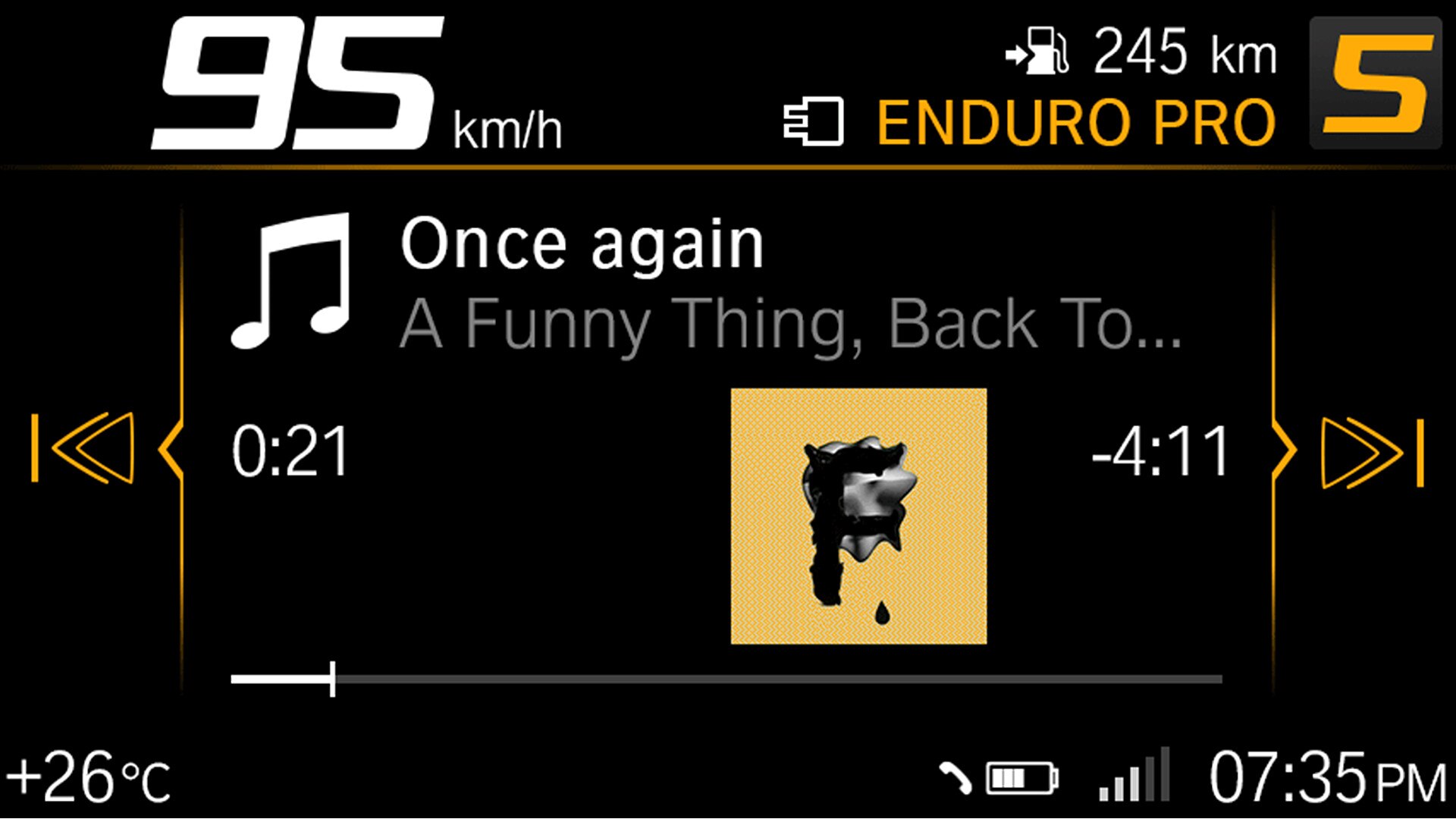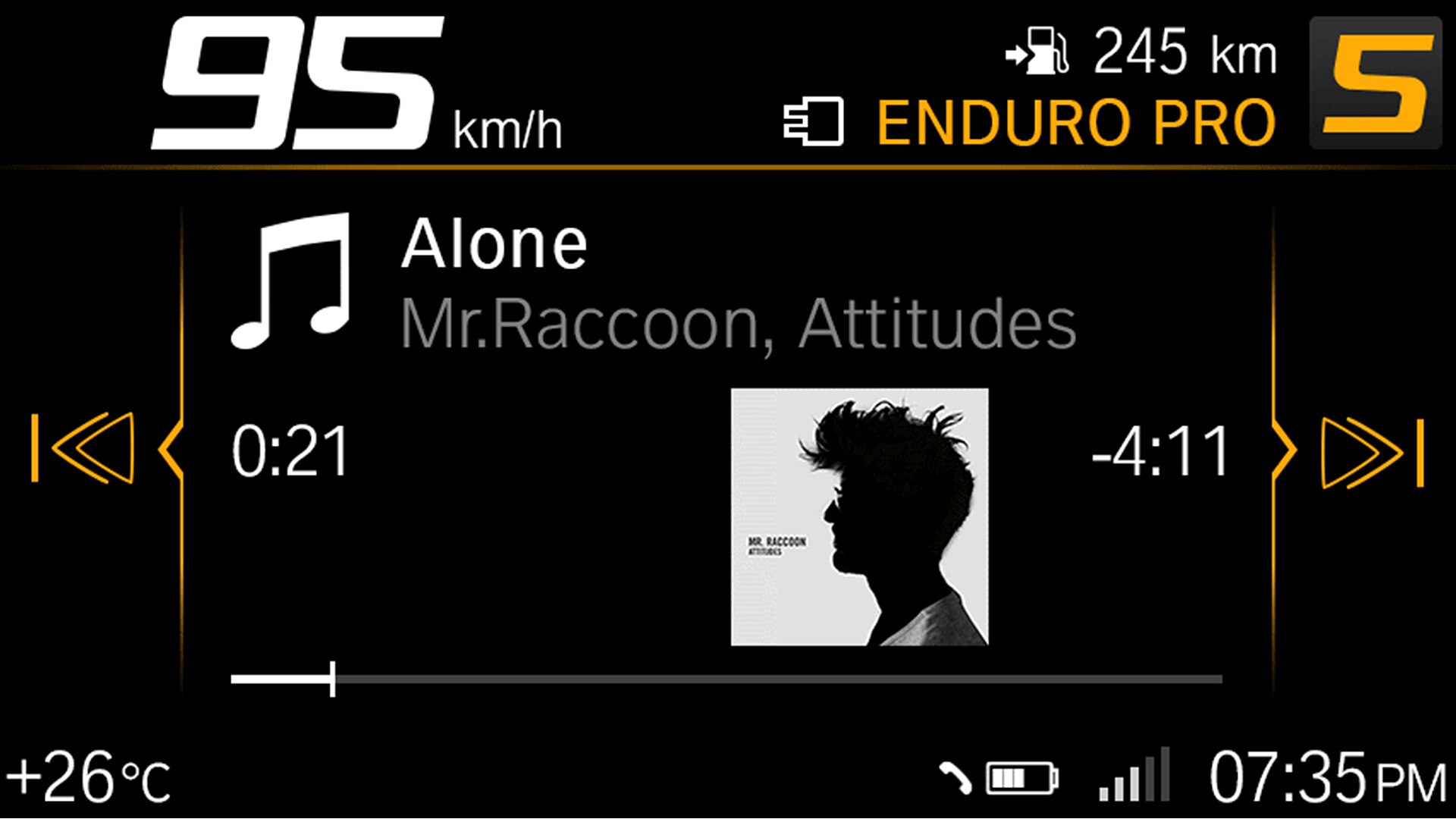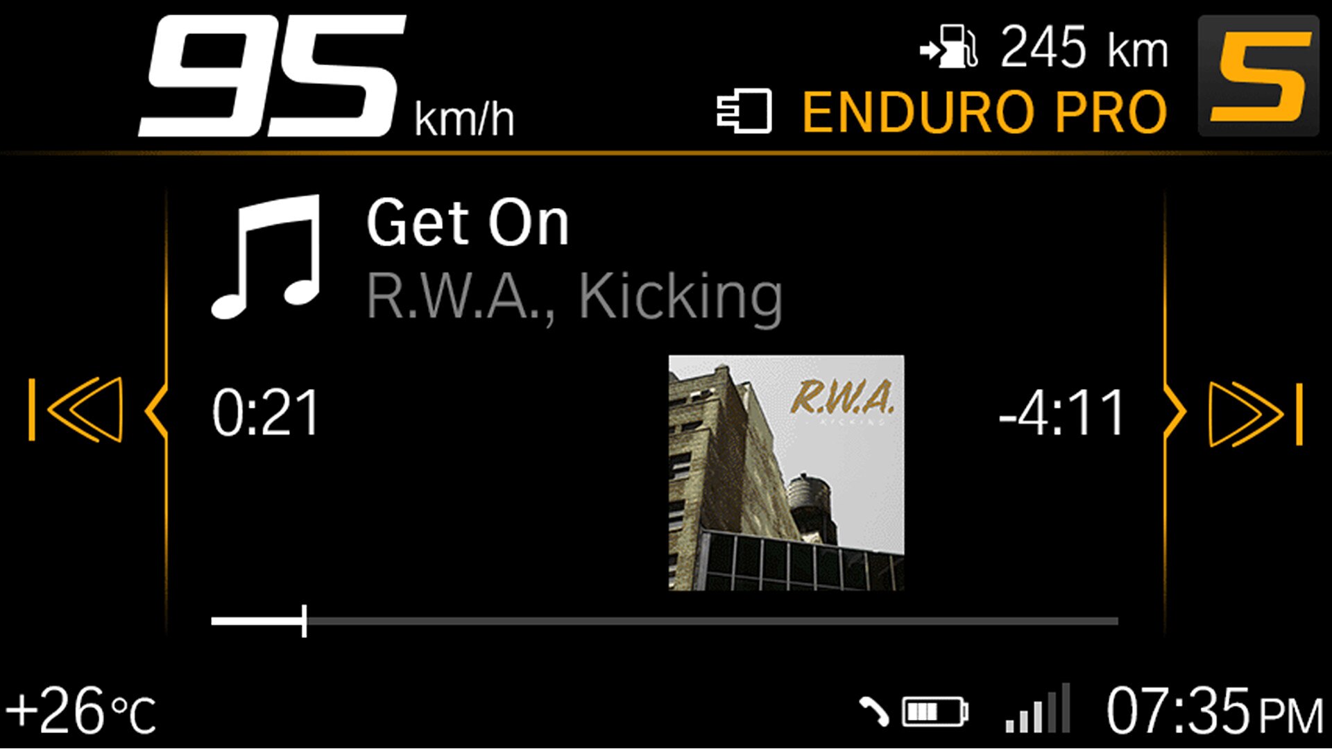 Puedes poner la música guardada en tu smartphone de forma fácil a través de la pantalla TFT usando el accesorio opcional Connectivity. Gracias a la conexión del casco al sistema de comunicación de BMW Motorrad puedes tener el tono perfecto. Si no te gusta alguna canción en concreto, puedes saltártela o volver hacia atrás fácilmente accediendo directamente al menú. Con el sistema de comunicación de BMW Motorrad, puedes ajustar fácilmente el volumen y la función silenciosa a través del Multicontrolador. Así, todos los conductores pueden escoger su lista de canciones en la carretera.
